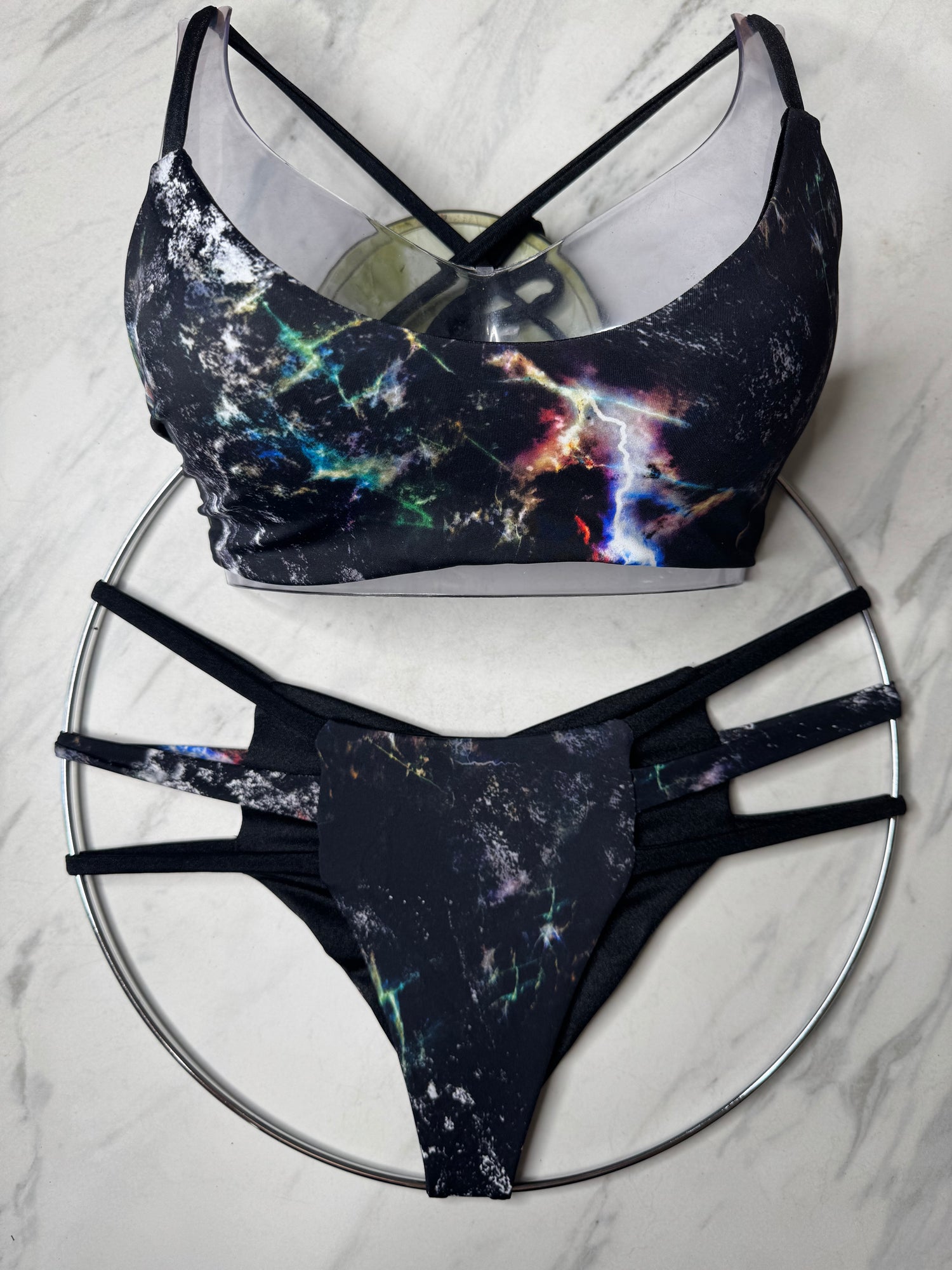 The Black Marble "Austin" Top combines style with comfort. With its criss cross ties in the back, this bikini top provides a secure and flattering fit. Made from high-quality black marble fabric, it adds a touch of sophistication to any beach or poolside look. Don't compromise on style or comfort - choose the "Austin" top!