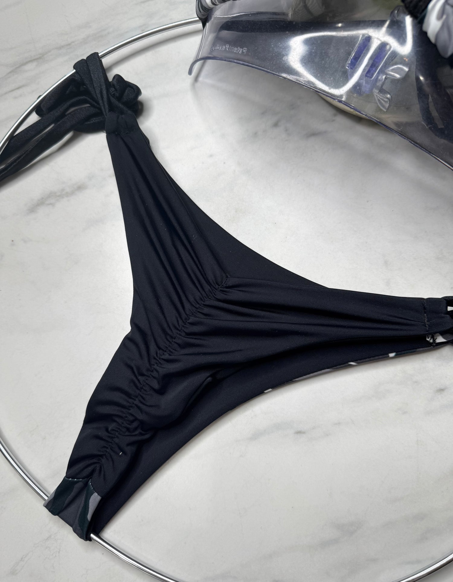 Indulge in a fierce and stylish swimwear with the Camouflage Micro Tie Bottom. Proudly handmade in the USA, this gray camouflage print bikini bottom features micro tie sides and subtle scrunch detailing for a comfortable and flattering fit. Embrace your wild side while showing off your patriotism!