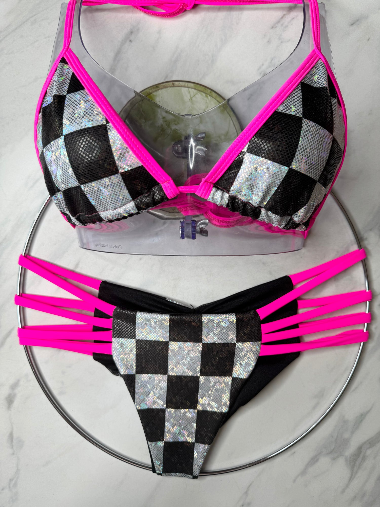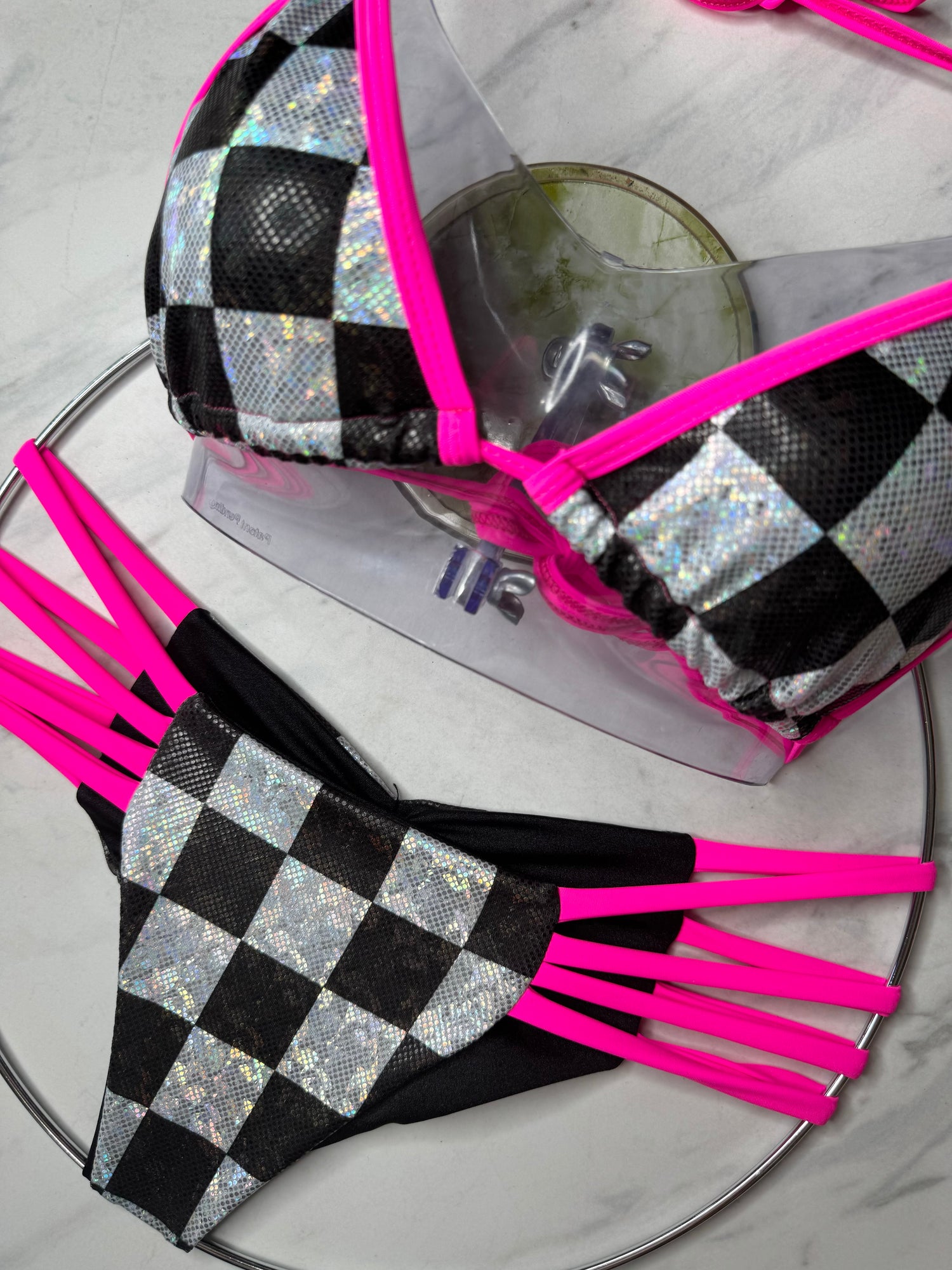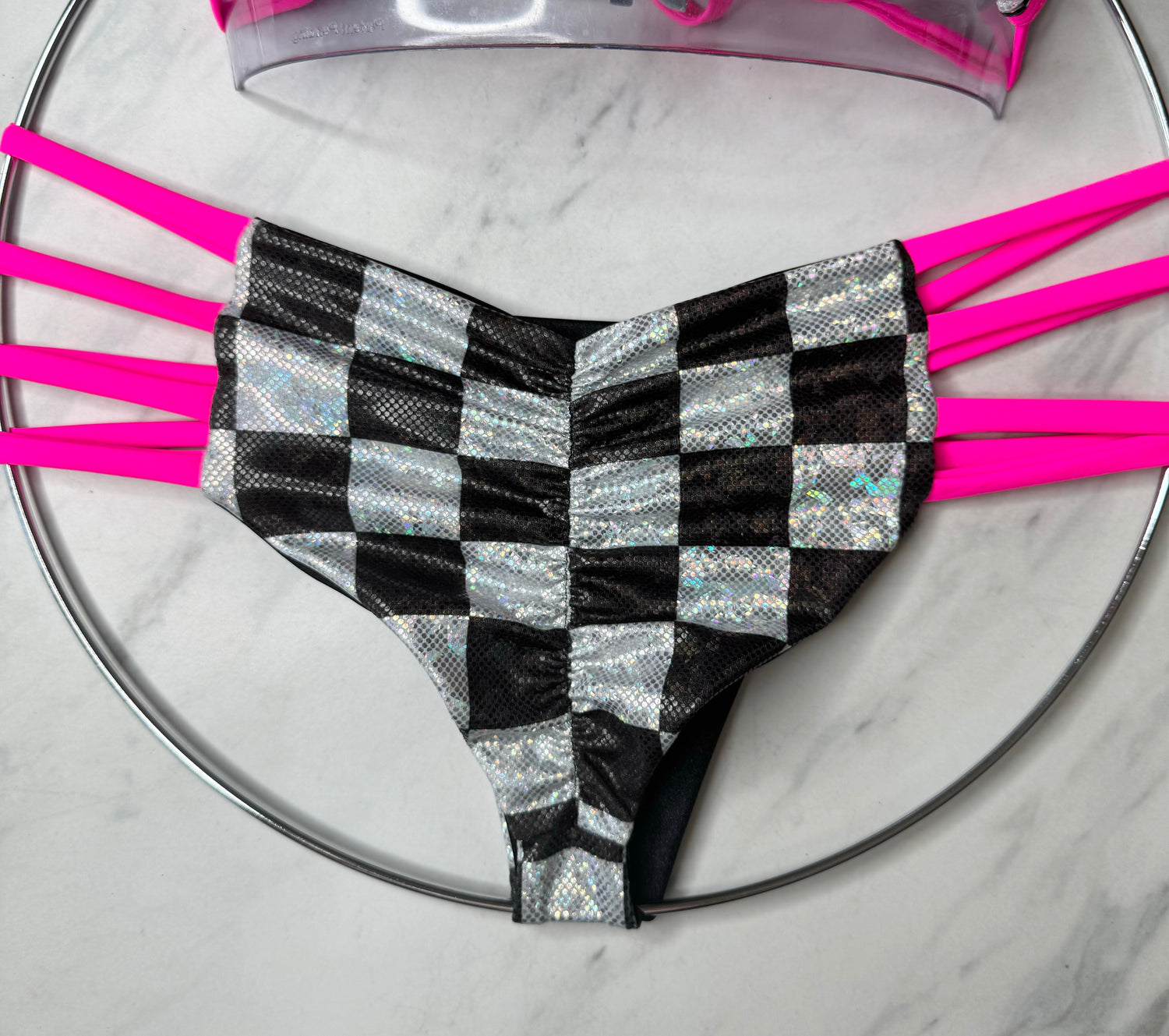 Experience the perfect blend of style and comfort with our Checker "Kona" Bottom. The bright neon pink strings contrast beautifully against the checkered sparkle design, adding a pop of color to your beachwear. Bring out your inner confidence and shine with this trendy bikini bottom.