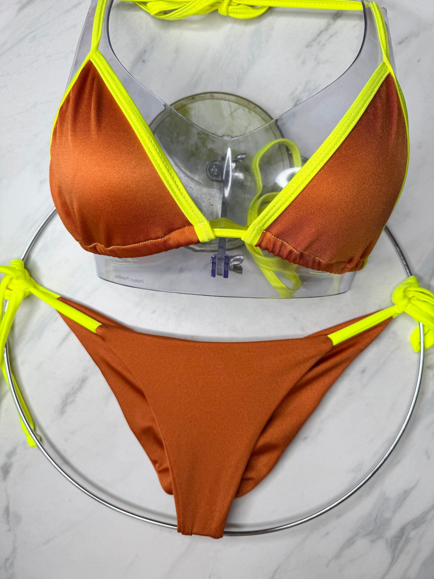Be effortlessly stylish and unique with our copper & neon yellow bikini. Handmade in the USA, this bikini top is a one-of-a-kind piece that will make you stand out at the beach or pool. Embrace the vibrant energy and high-quality craftsmanship of this bikini.