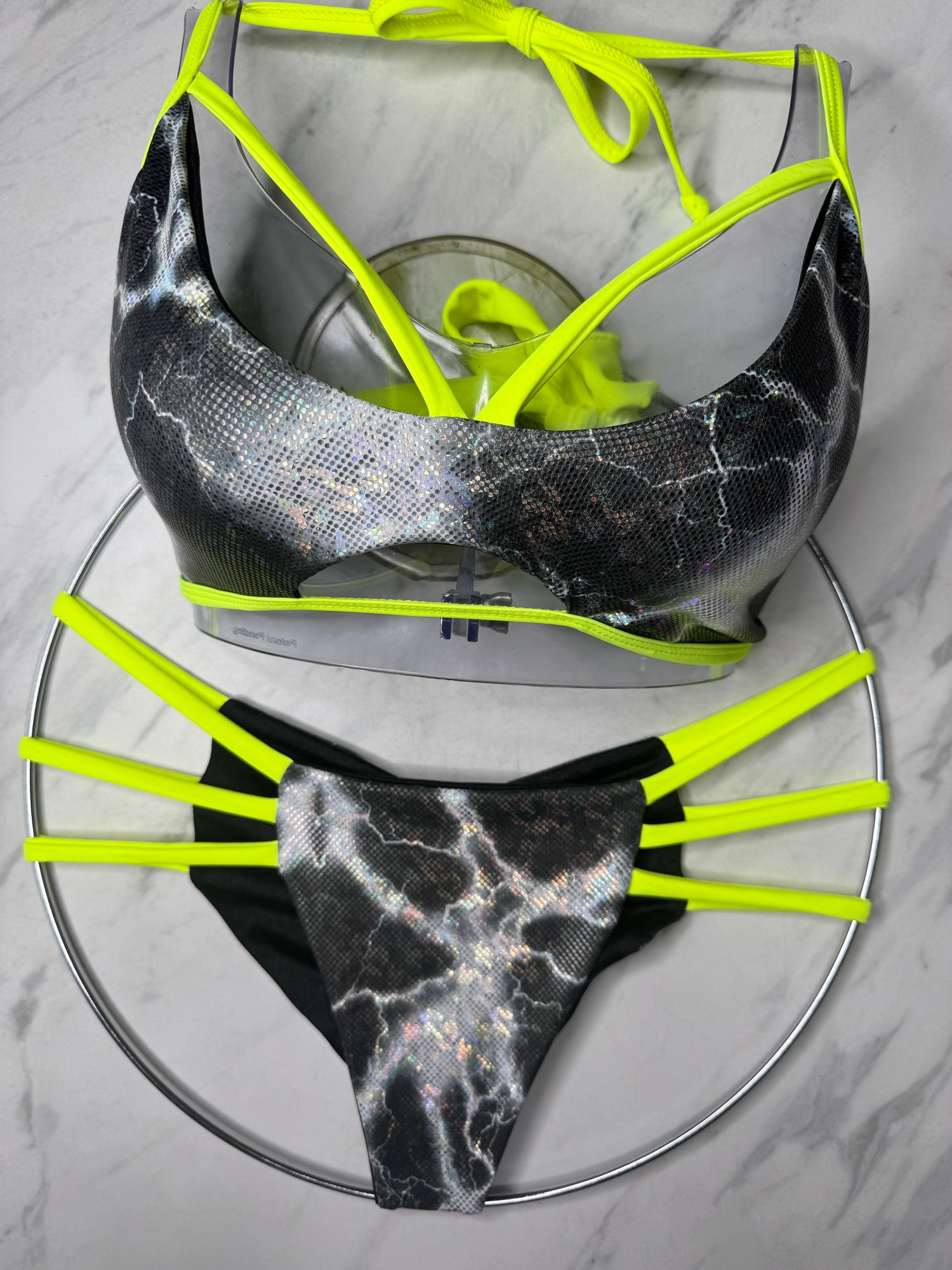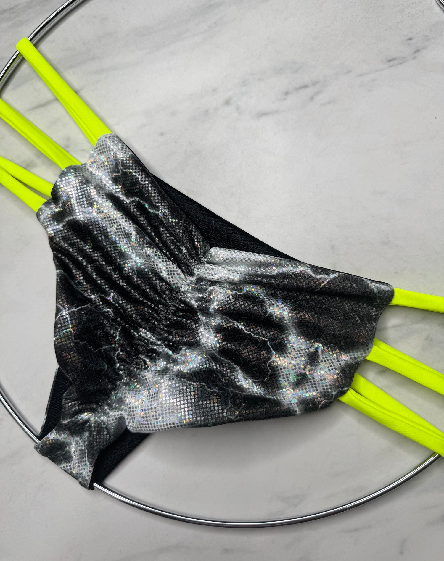 Experience bold style and superior comfort with our Lightning "Kona" Bottom! This top-selling bikini bottom features a stunning lightning metallic print, giving you a unique and eye-catching look. Step out with confidence and make a statement in this must-have addition to your swimwear collection.