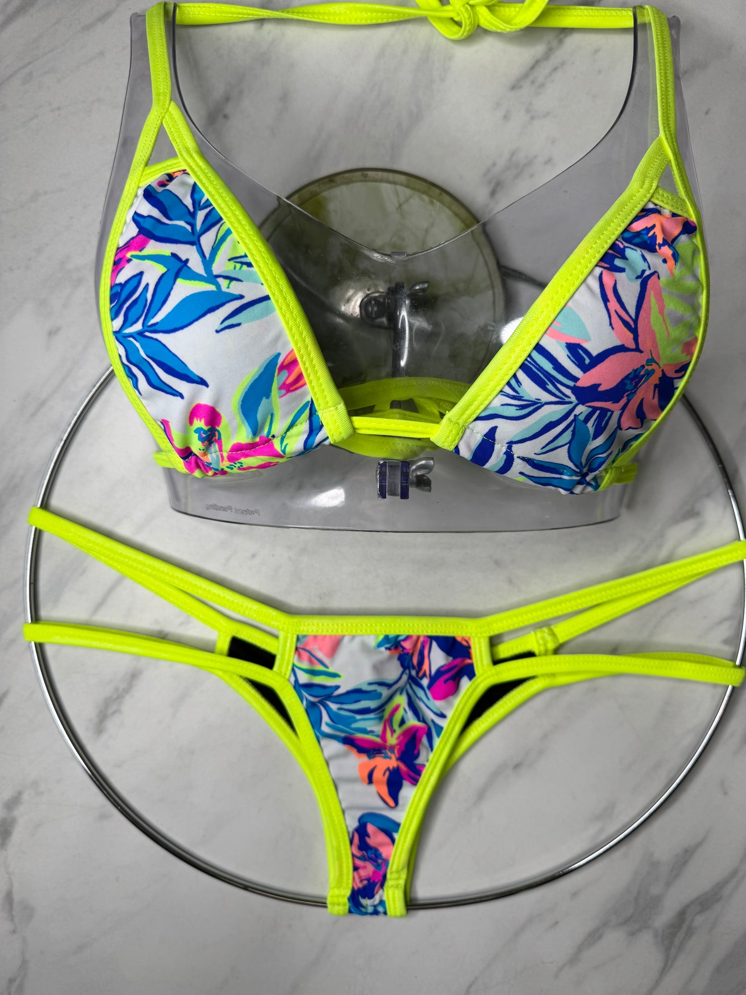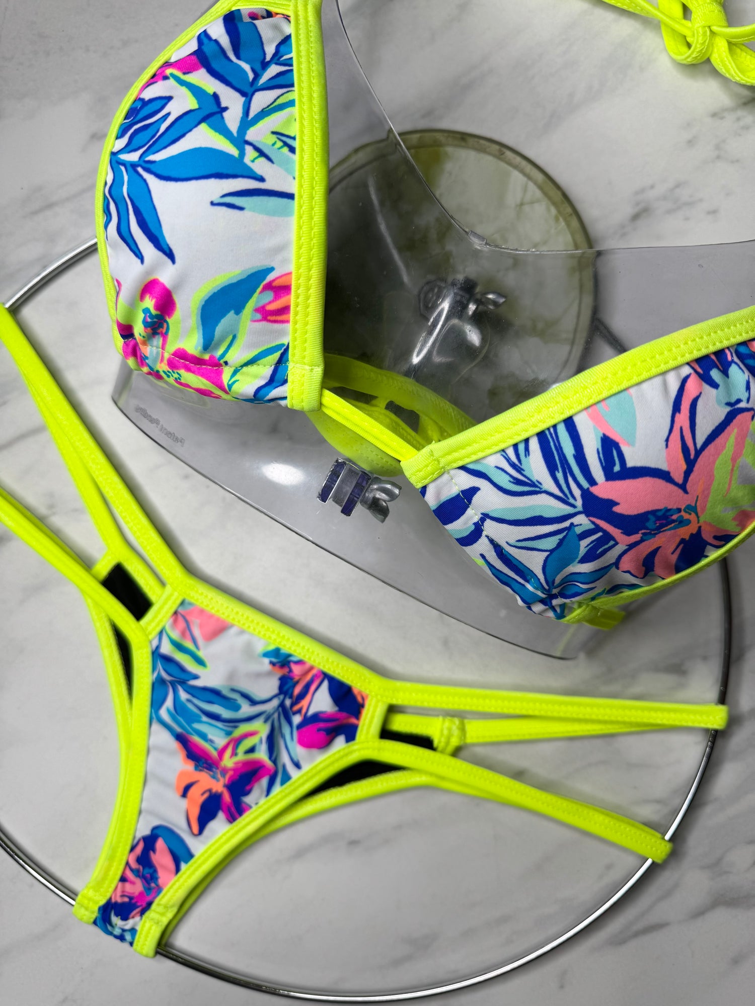 Elevate your beach style with our Neon Flower Micro Top! This bikini top features a vibrant neon flower print and an eye-catching neon yellow trim. Feel confident and bold while soaking up the sun in this must-have piece. Upgrade your swimwear game now!