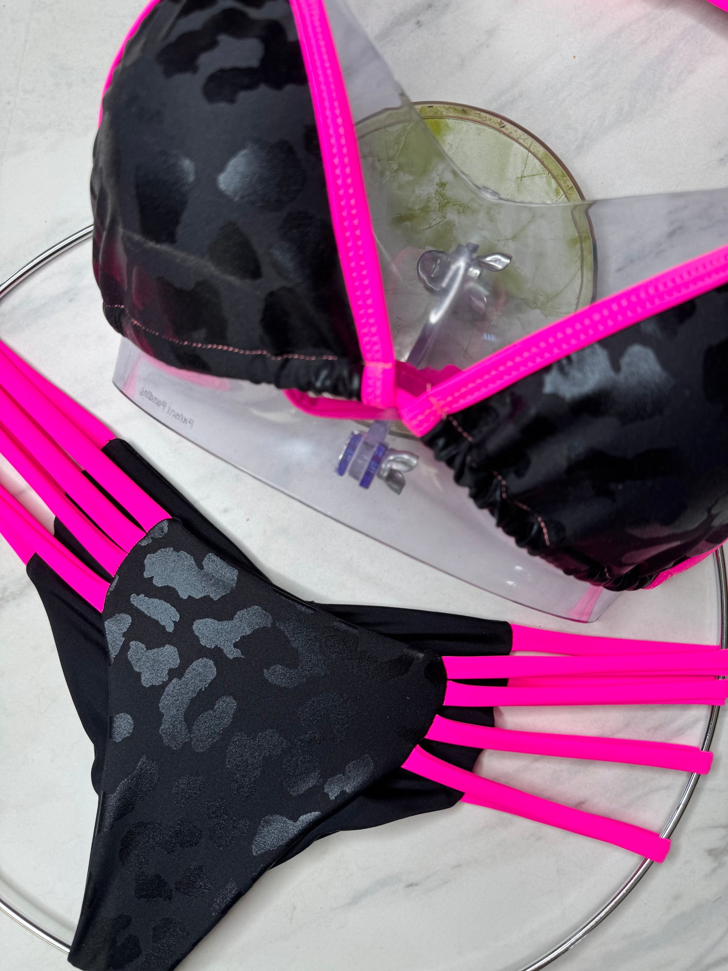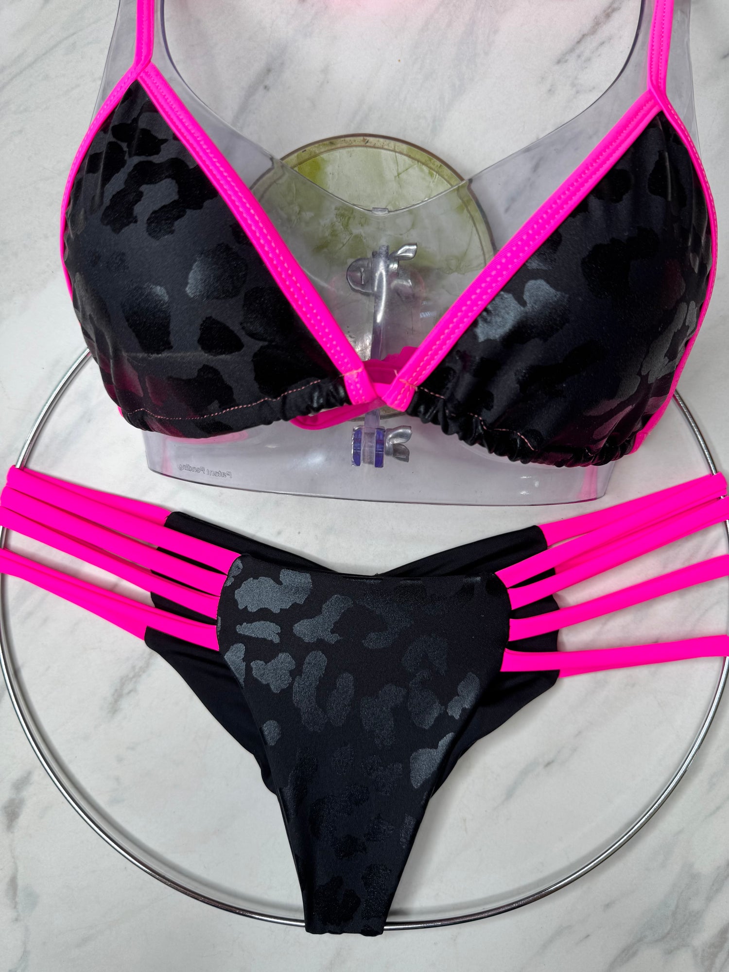 Unleash your wild side with the Noir Cheetah triangle top, featuring a striking black cheetah print elevated by vibrant neon pink trim that commands attention. Paired with our bestselling bottom and finished with seamless detailing throughout, this two-piece delivers the perfect balance of bold statement and refined comfort. Whether you're poolside or beachfront, this editorial-worthy set combines luxury aesthetics with everyday wearability—the ultimate piece for those who refuse to blend in.