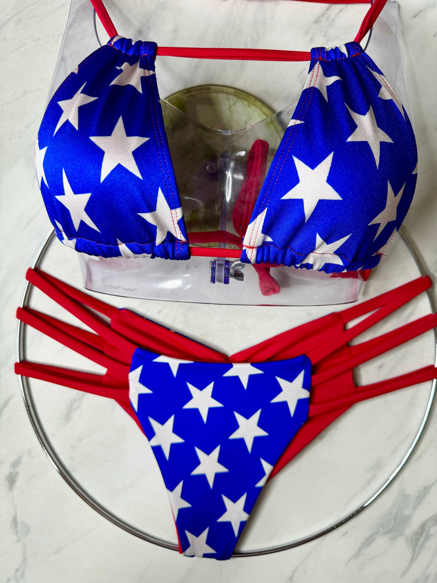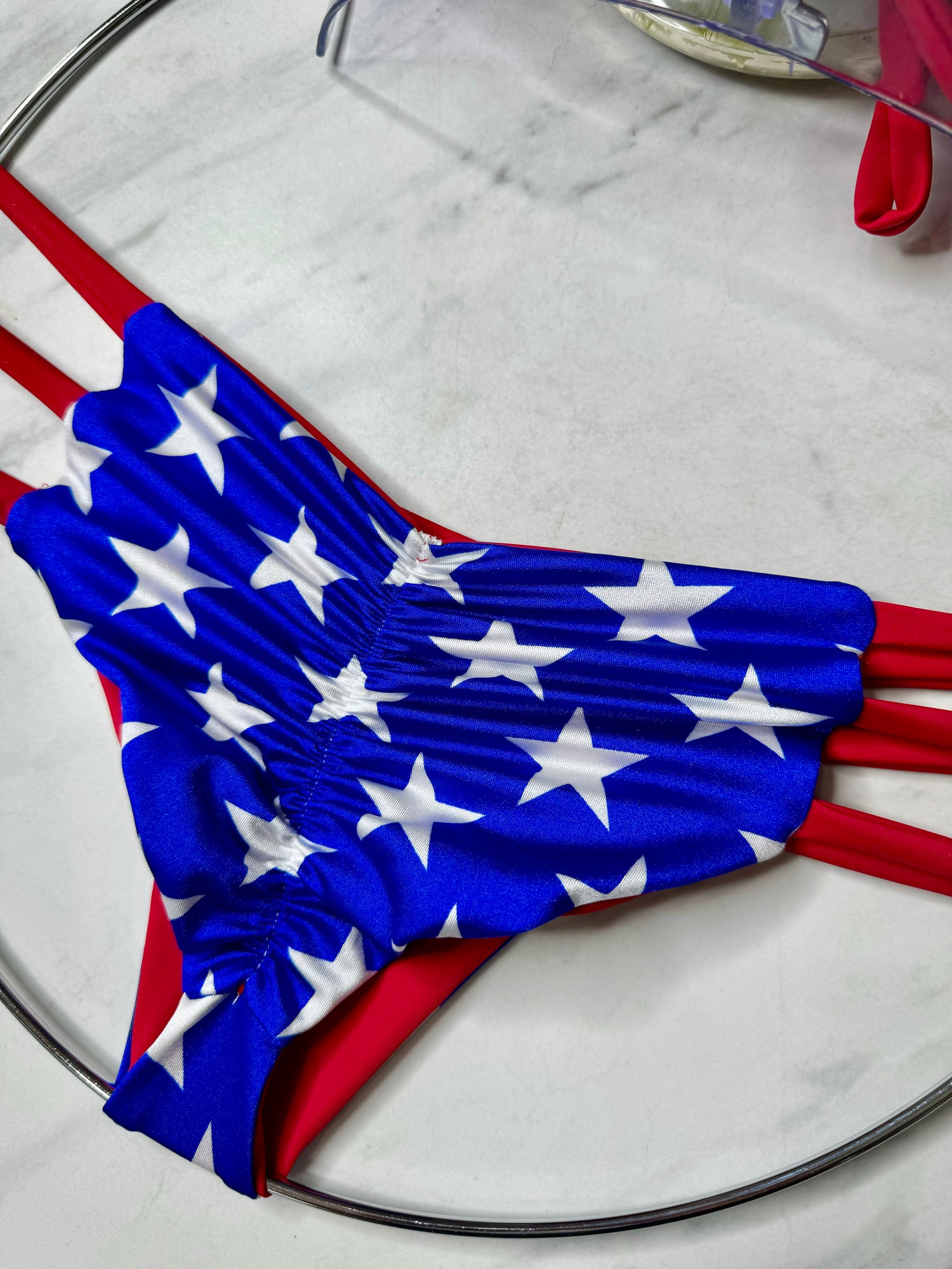 Embrace the summer sun in our Patriotic Blue Star Reversible Bottom. Made with a bold patriotic blue star print, this bikini bottom features a scrunch detail in the back for added style. With the option to wear it two ways, this versatile piece will be your go-to for all your beach days.