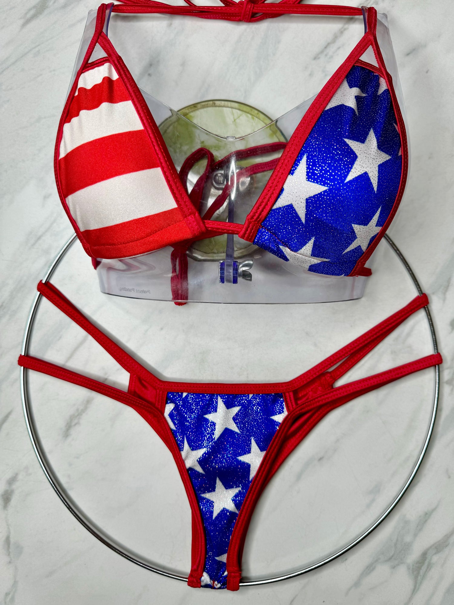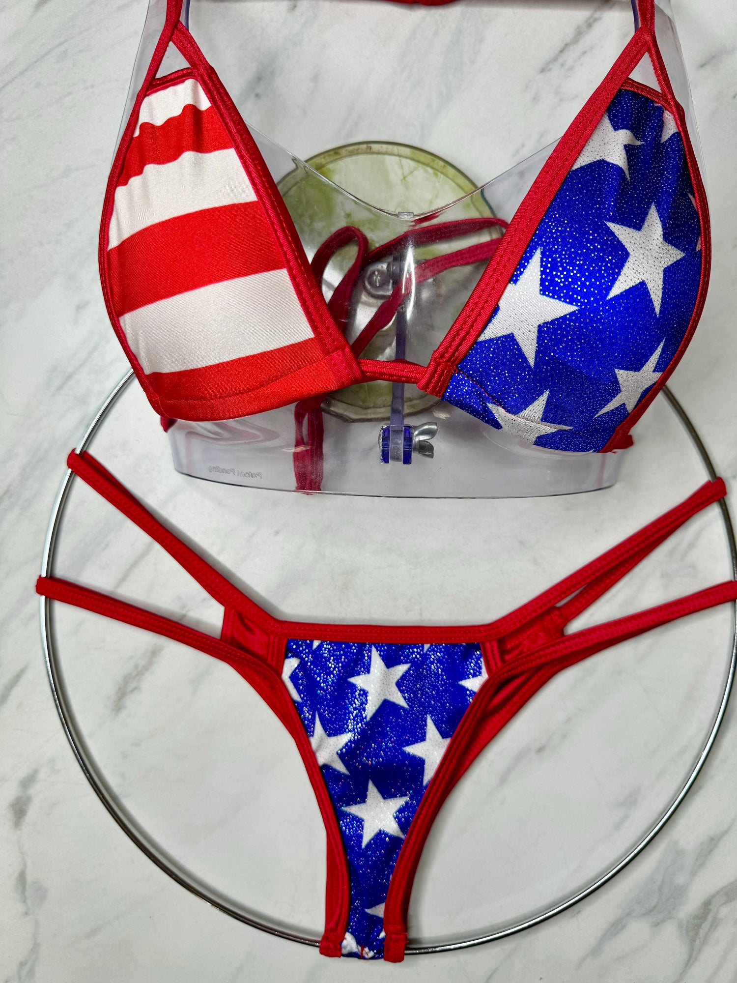 Get ready to shine on the beach with our Patriotic Sparkle Star Micro Bottom! This bikini bottom features a patriotic sparkle star design accented with bold red trim. Stand out and show your love for your country in style. Get yours today and make a statement!