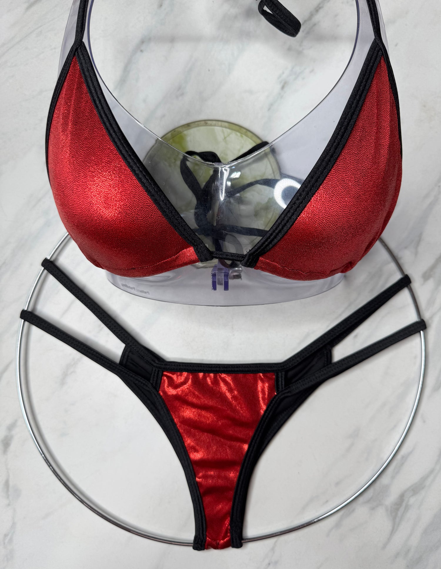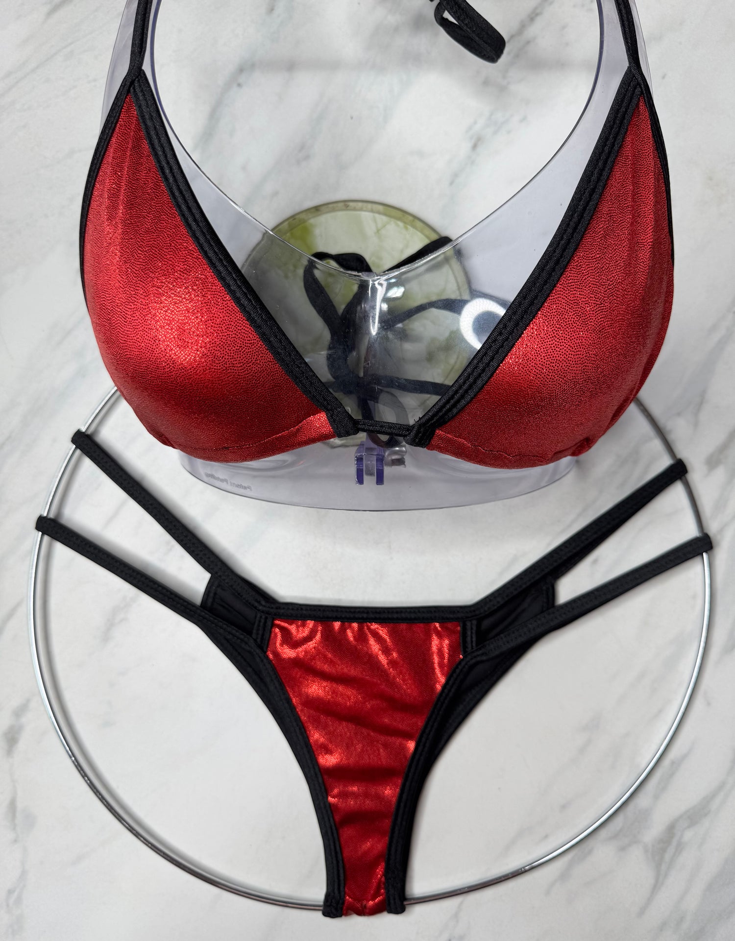 This bold and eye-catching red metallic triangle top with black trim is a classic addition to any beach or poolside outfit. The metallic sheen adds a touch of glamour while the timeless triangle design provides comfortable support and a flattering fit. Embrace your inner beach goddess and make a statement with this must-have bikini top!