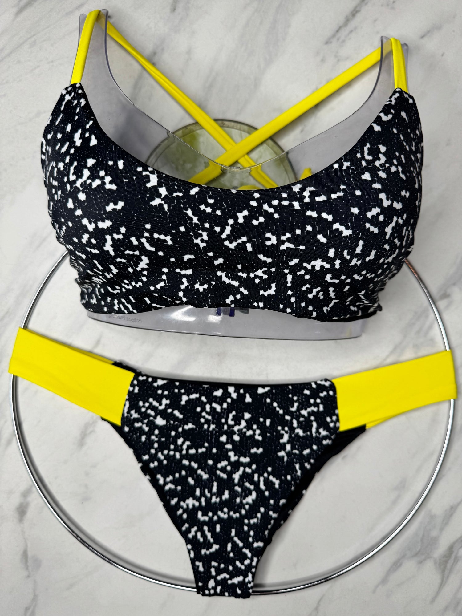 The Sun Kissed Pebbles Bikini features a vibrant yellow seamless bottom for a smooth, comfortable fit. The top showcases an eye-catching crisscross tie design that wraps around the torso—not the neck—delivering style with secure support. Perfect for turning heads while enjoying the sun and sea.